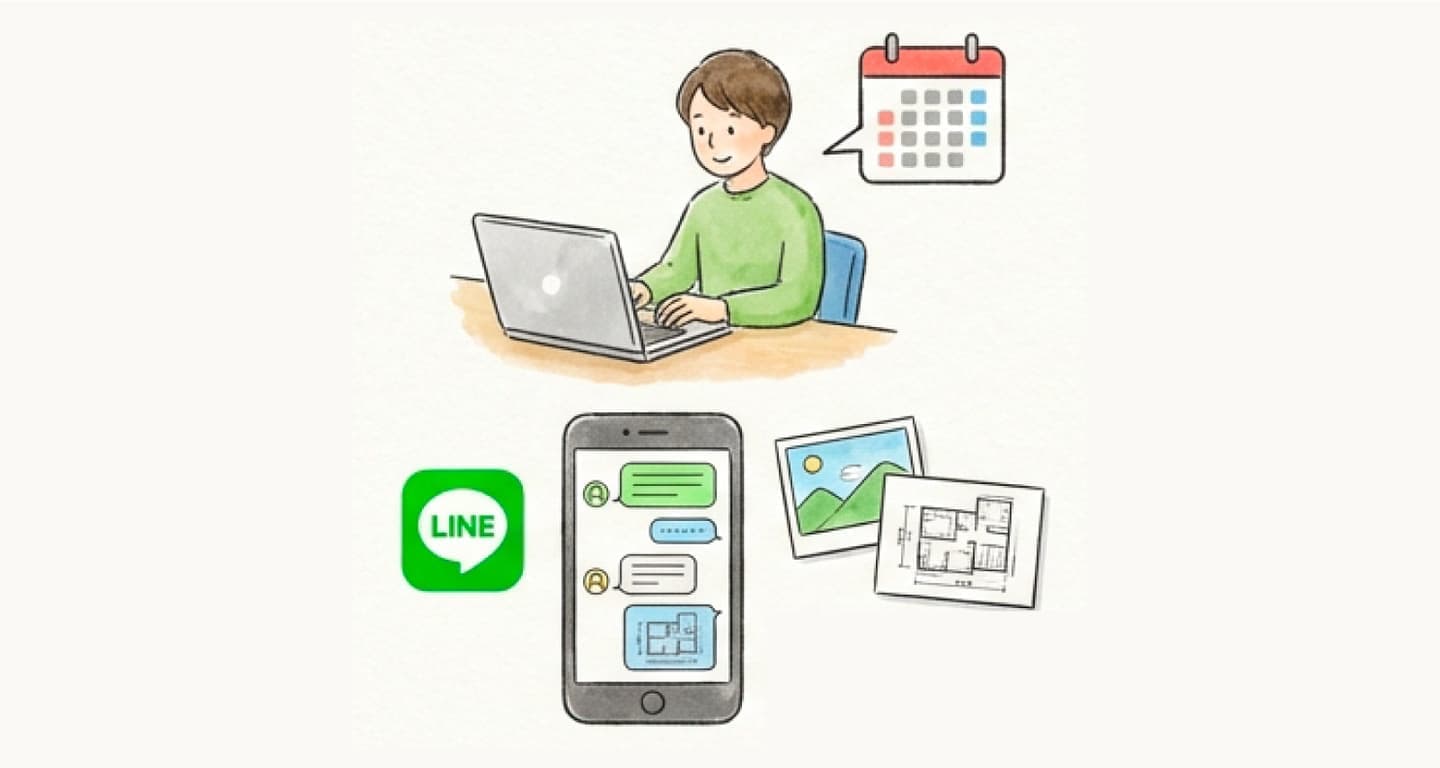 事前にLINEメッセージにて、間取り図や、理想のイメージ写真、その他ご予算やご希望などをお送りいただく事が可能です。お引越し前や、検討段階でもお気軽にご相談ください。